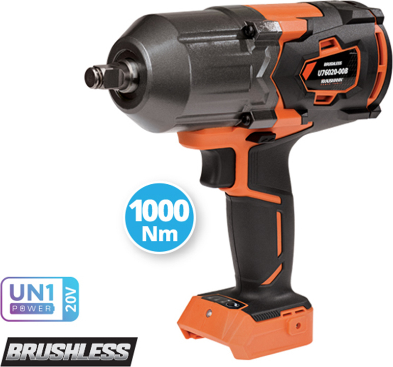 Μπουλονόκλειδο επαναφορτιζόμενο KRAUSMANN® U76020-00B υψηλής ροπής 1000Nm με αυτόματο φρένο στο ξεβίδωμα, ιδανικό για βίδωμα ή ξεβίδωμα μπουλονιών και παξιμαδιών.