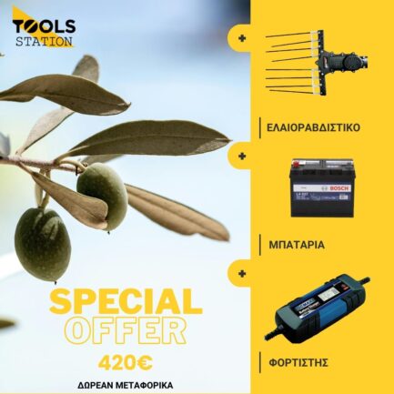 Ολοκληρωμένο σετ ελαιοραβδιστικού με μπαταρία και φορτιστή.